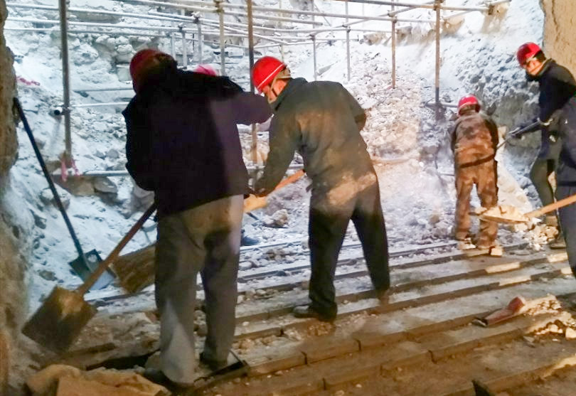 为提高工作效率,大家明确分工,兵分三路进行作业。组进入篦冷机内部将物料移至下料口,另组用板车在下料口接料,后组负责将板车运送来的料子装入铲车的斗子里。篦冷机里粉尘弥漫,呛得大家止不住地咳嗽,但突击队员们克服困难,大家分工协作,干得热火朝天,为检修抢时间、抢进度。