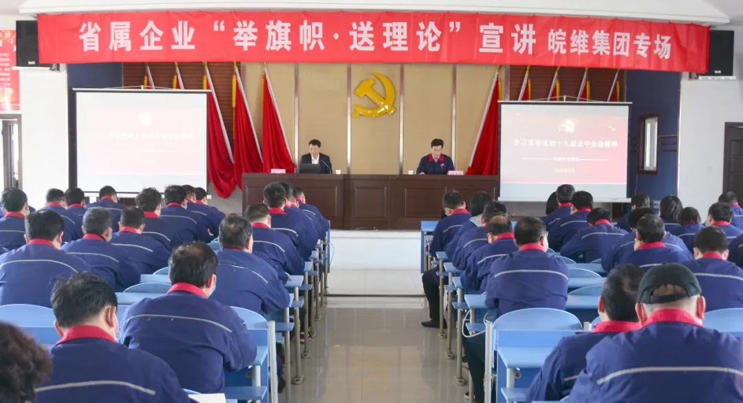 为全面深入学习领会党的十九届五中全会精神,引导广大党员干部职工把思想和行动统一到全会精神上来,省国资委党委组织“举旗帜·送理论”宣讲团,深入省属企业基层开展宣讲。3月24日下午,省国资委宣讲团成员、省国资委企业领导人员管理处处长金进来皖维作十九届五中全会精神专题辅导报告。集团公司党委委员,股份公司党委副书记、总经理孙先武主持宣讲会。