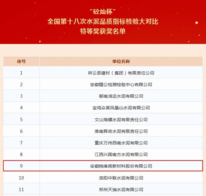? 根据工业和信息化部《关于提升水泥质量保障能力的通知》文件要求,“砼灿杯”全国第十八次水泥品质指标检验大对比于今年3月份启动,共有1331家水泥企业、质检站参加。“特等奖”是本次比赛设定的最高荣誉,此次大对比共评选出特等奖36家,皖维公司就是其中之一。